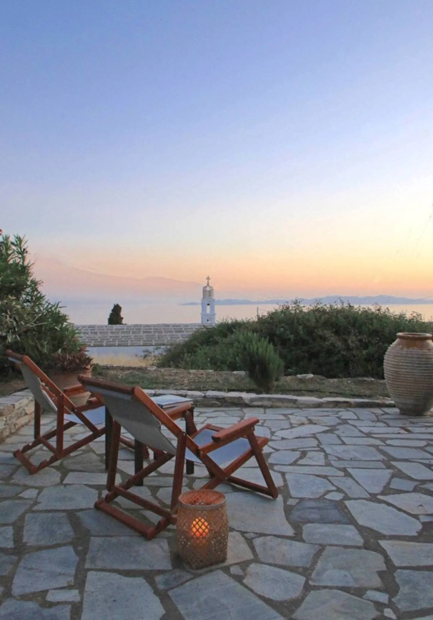 From the northern side of the home, you enter the property through a garden door with beautiful views out to sea and Chora. This is a safe and enclosed space to enjoy time outside in the garden. There is also an outdoor shower to wash off sand from the beach. The main dining space is here, under the patio.